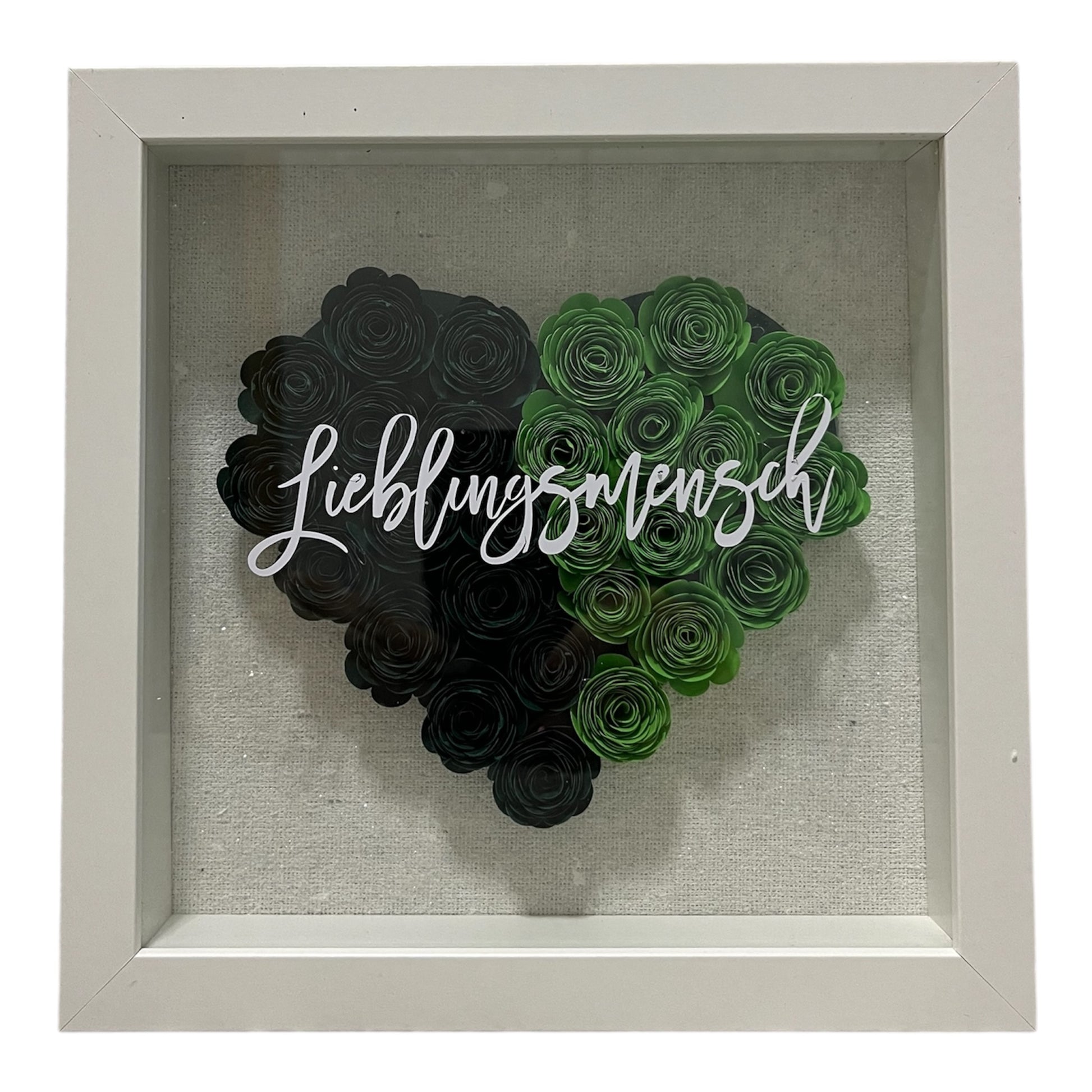 Dieser Bilderrahmen hat einen weißen Hintergrund mit Glitzer. Die Rosen sind aus hell und dunkelgrüne Blüten. Jede Blüte wurde aus Papier gefertigt. Der Schriftzug ist aus weißem Vinyl geplottert.