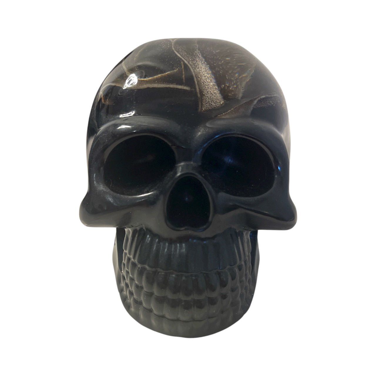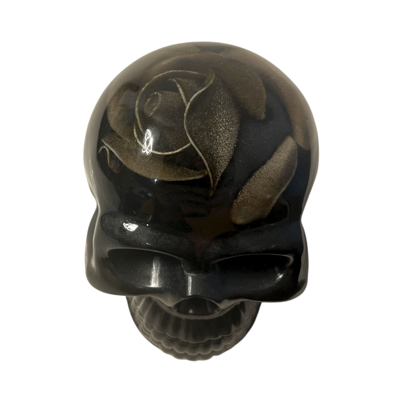 Der Finsterblüte verbindet ein tiefschwarzer Totenkopf mit einer zarten grauen Rose, die sich wie eingeflossen in das Motiv zieht. Diese kraftvolle Kombination symbolisiert das Zusammenspiel von Dunkelheit und Schönheit – perfekt für alle, die mit Stil und Mut ein Statement setzen möchten.