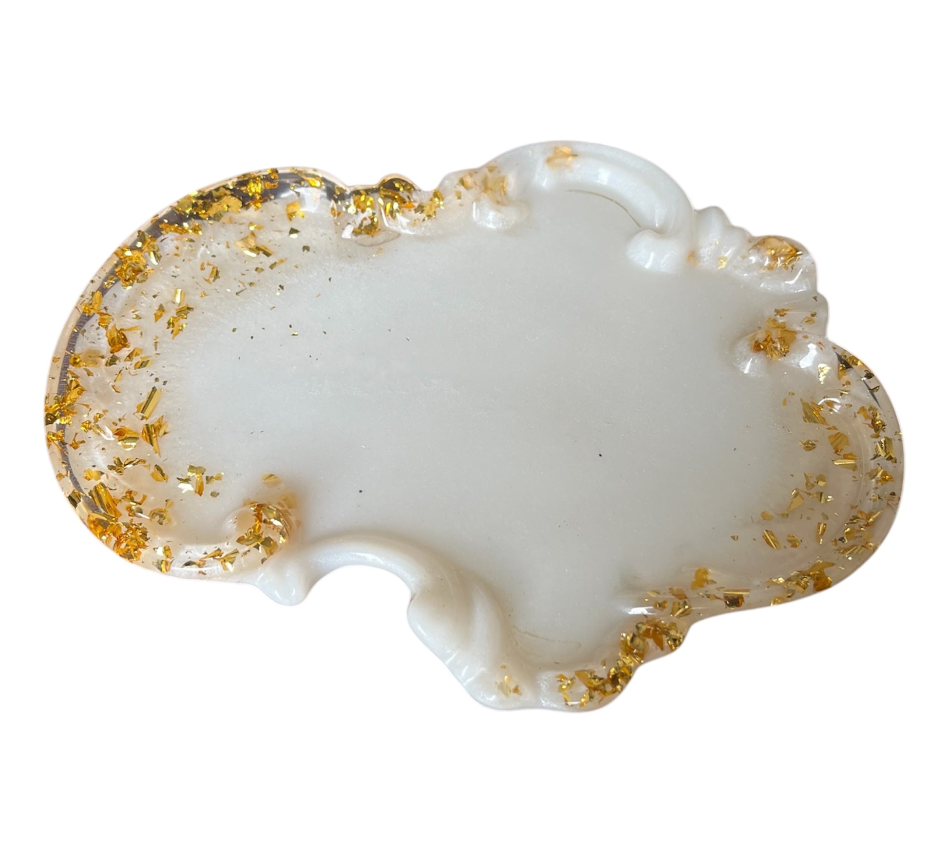 Der Untersetzer hat ein elegantes Design. Die Seiten sind leicht geschwungen. Die Farben sind weiß/metallicgold und Blattgold