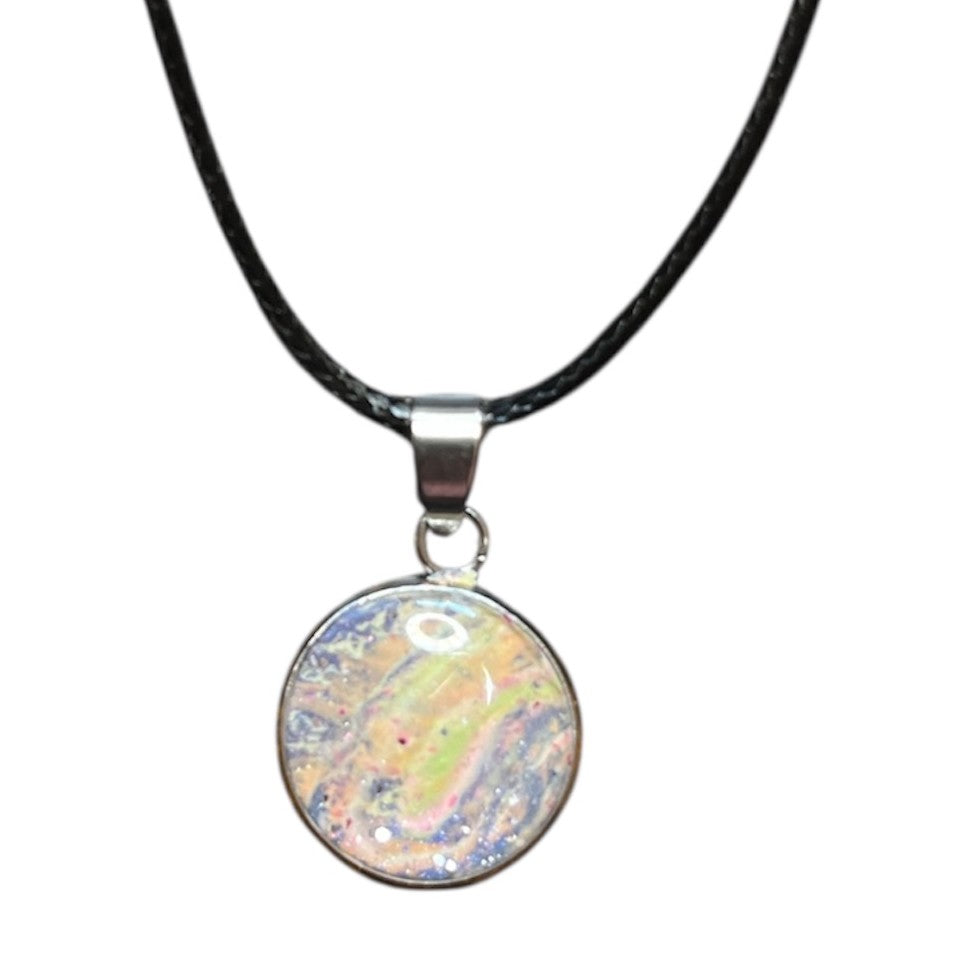 Diese außergewöhnliche Halskette mit leuchtendem Muster auf einem 14 mm Lünette-Anhänger fordert die Dunkelheit heraus. Das robuste Wachsseil trifft auf kühlen Edelstahl, während das in Epoxidharz eingefangene, phosphoreszierende Design nach Einbruch der Nacht sein wahres Gesicht zeigt. Ein Statement-Stück für alle, die sich trauen, anders zu sein.