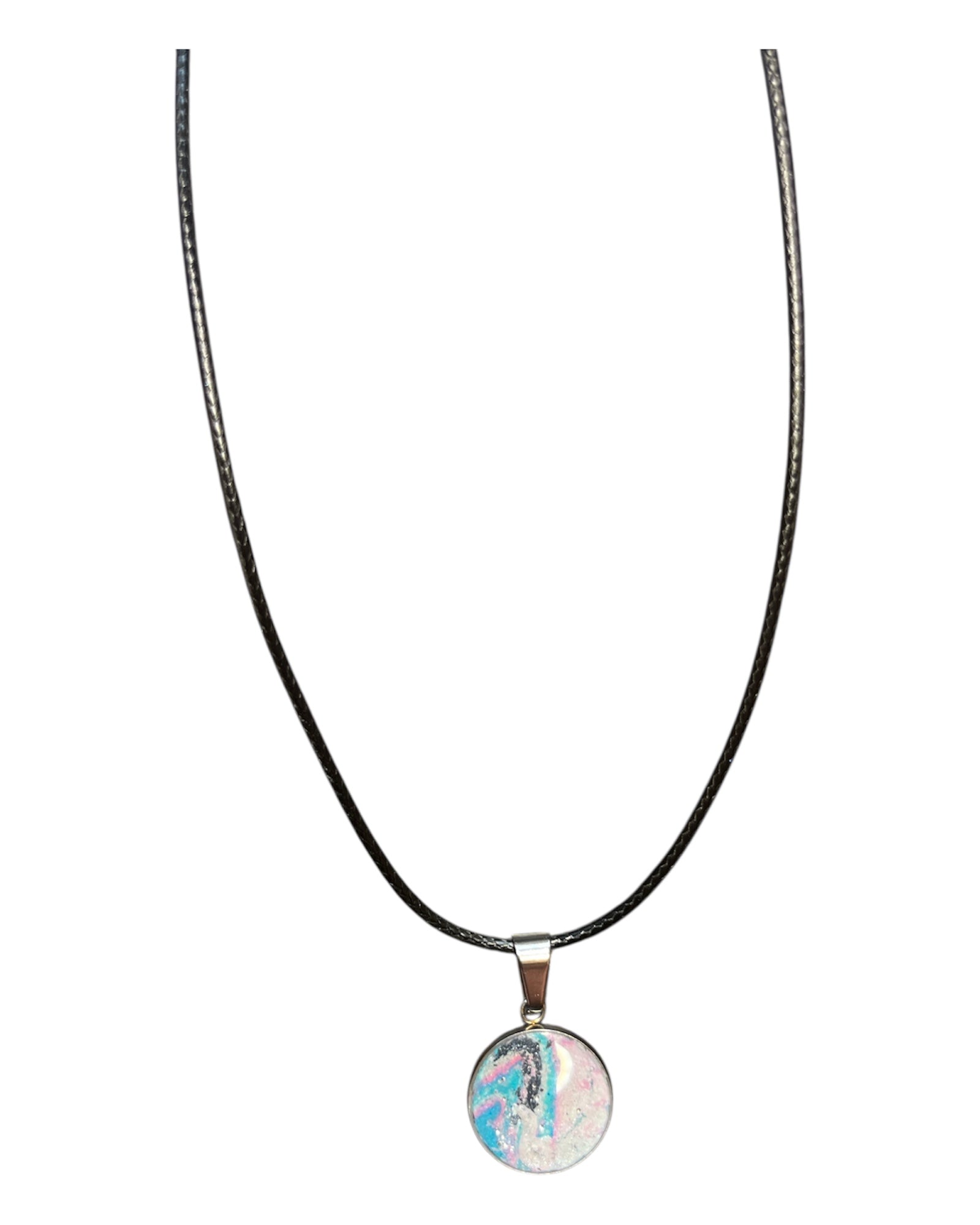 Diese präzisionsgefertigte 14 mm Edelstahl-Lünette zeichnet sich durch ein komplexes Blau-Rosa-Muster aus, das in hochwertigem Epoxidharz konserviert wurde. Die Halskette kombiniert metallische Beständigkeit mit kunstvoller Farbkomposition für langanhaltende Ästhetik und Tragbarkeit.