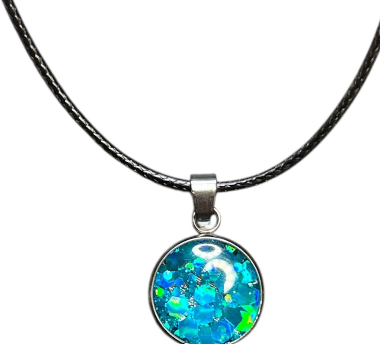 Halskette mit schimmerndem blau-Glitzer und einem Cabochon in einer 14 mm Edelstahl-Lünette. Die präzise Fassung betont den funkelnden Glitzereffekt optimal, während der Edelstahl Langlebigkeit und Hautverträglichkeit garantiert. Ein elegantes Accessoire für besondere Anlässe oder den Alltag.