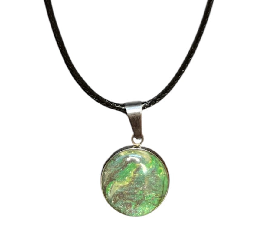Hochwertige Edelstahl-Halskette mit 14 mm Lünette, gefüllt mit präzise verarbeitetem Epoxidharz in elegantem grün mit Glitzer. Die sorgfältige Verarbeitung garantiert ein langlebiges Schmuckstück mit ausgezeichneter Farbstabilität und angenehmer Trageeigenschaft.