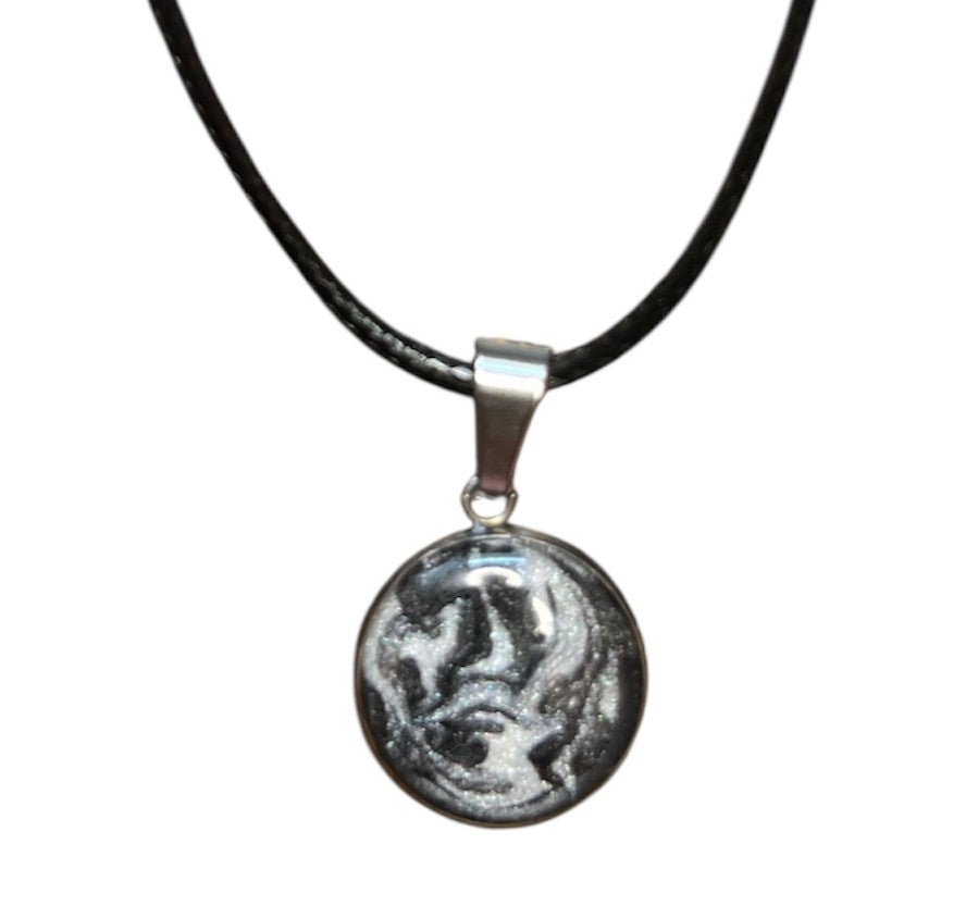 Hochwertige Edelstahl-Halskette mit 14 mm Lünette, gefüllt mit präzise verarbeitetem Epoxidharz in eleganter schwarz-weißer Marmoroptik. Die sorgfältige Verarbeitung garantiert ein langlebiges Schmuckstück mit ausgezeichneter Farbstabilität und angenehmer Trageeigenschaft.