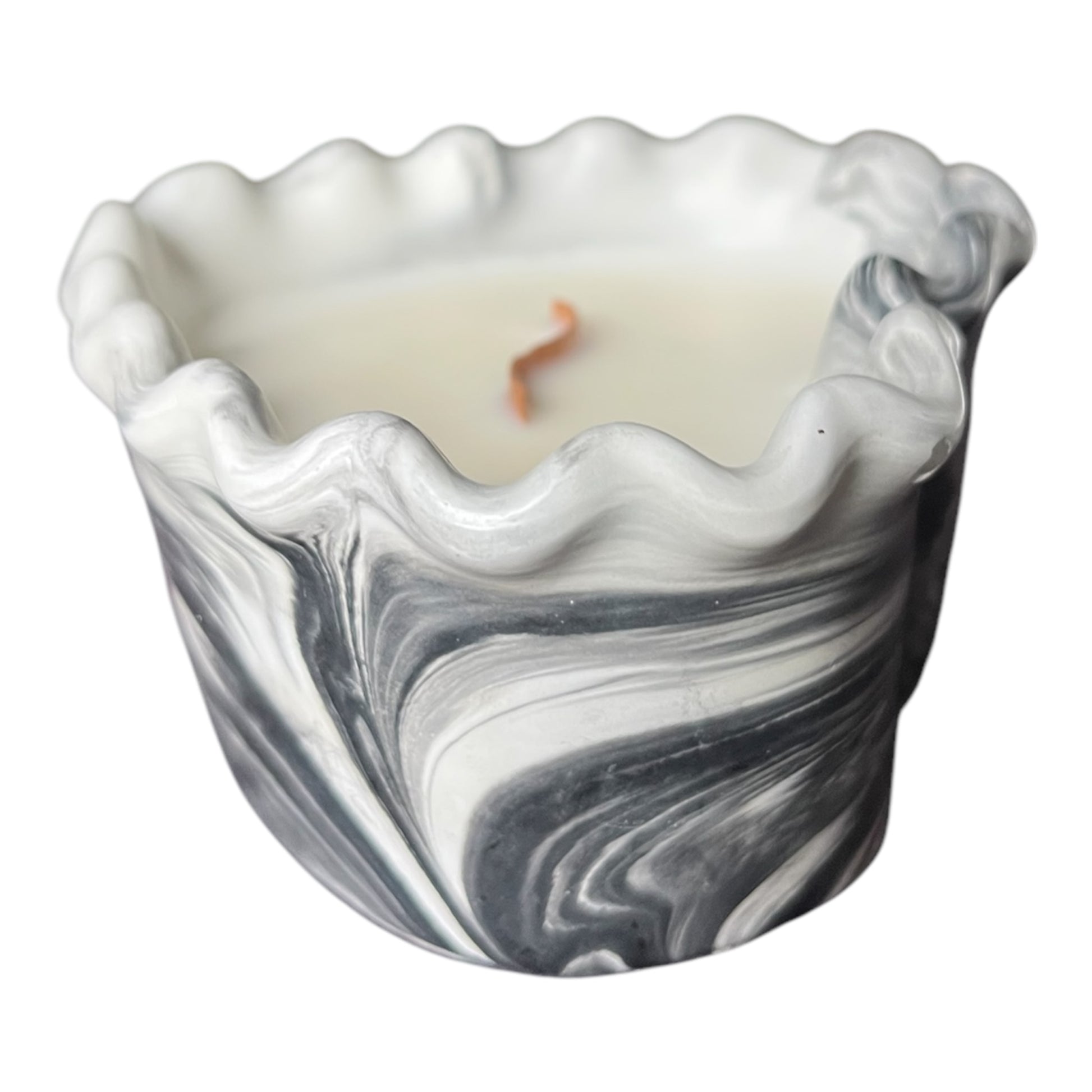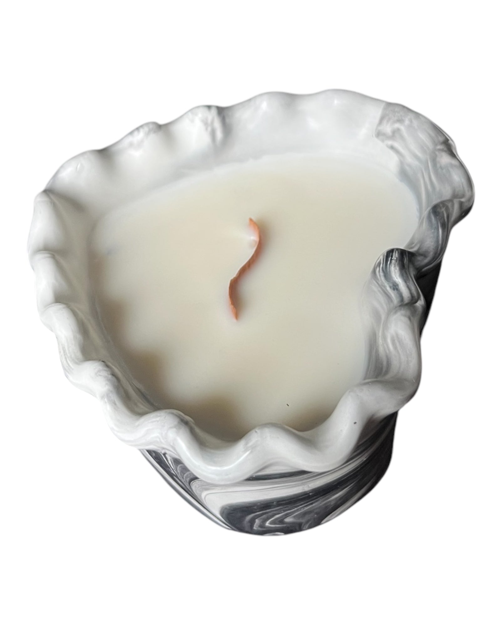 Diese Herzschale hat einen Marmoreffekt aus schwarz und weiß. Hier wurde ein S - Holzdocht verwenden. Ein Duft ist kaum wahrnehmbar, außer der Duft von Sojawachs. Der Wachsanteil beträgt ca 90 g.