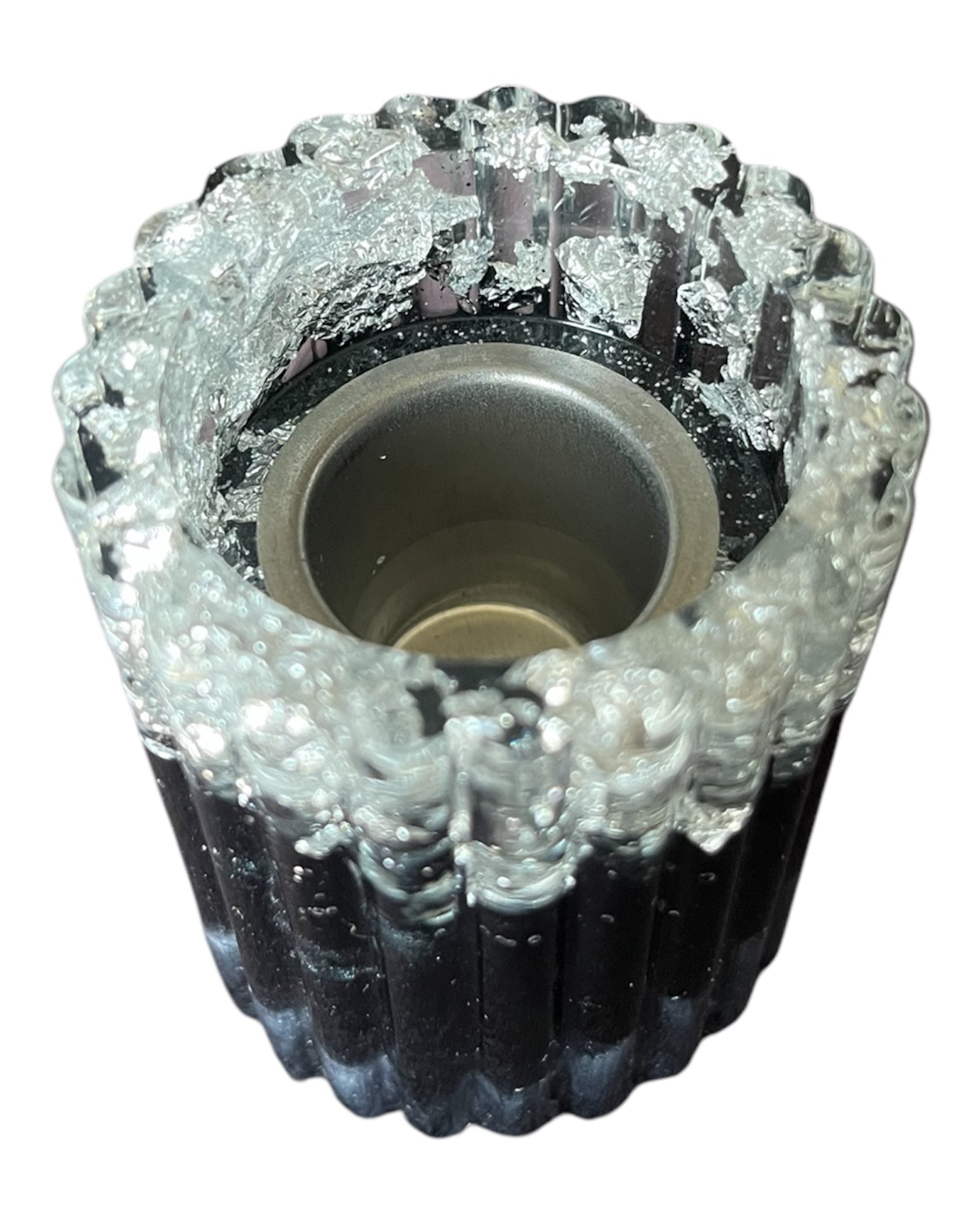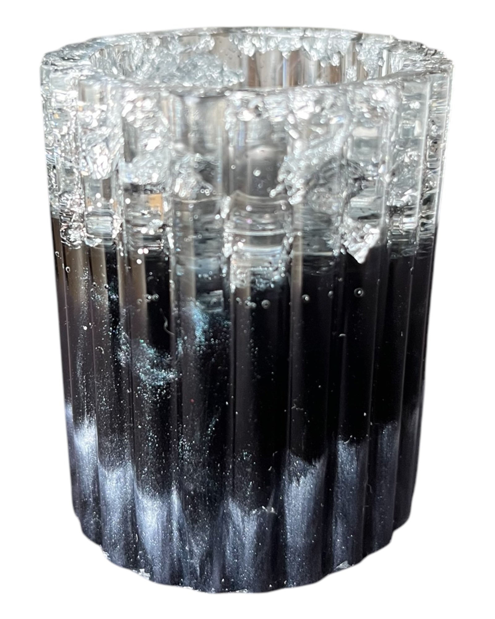 Handgemachter Kerzenhalter aus Resin. Die Grundfarbe des Halters ist schwarz/silber mit Metallic und Blattsilber. Für Stabkerzen geeignet.