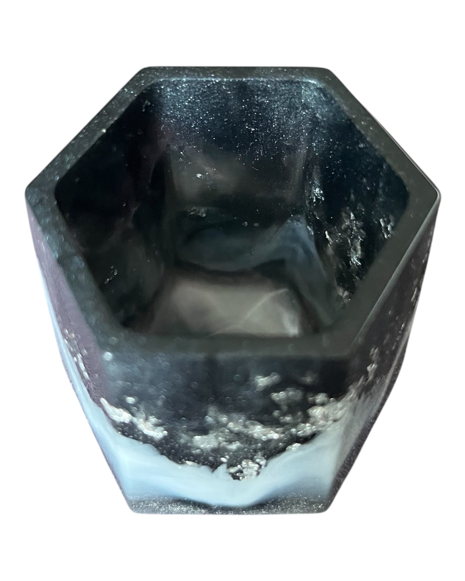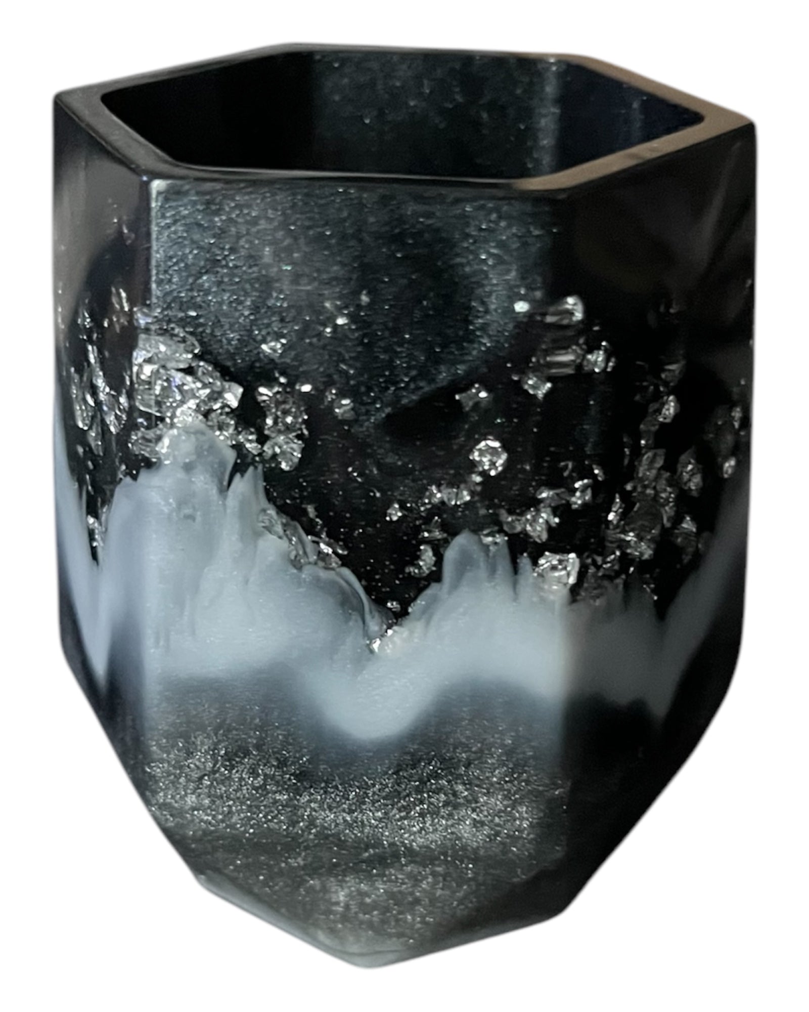 Kleine Becher aus Resin. Geeignet für Wattestäbchen, Zahnputzbecher usw. Die Farben sind aus schwarz/weiß/silber und Blattsilber