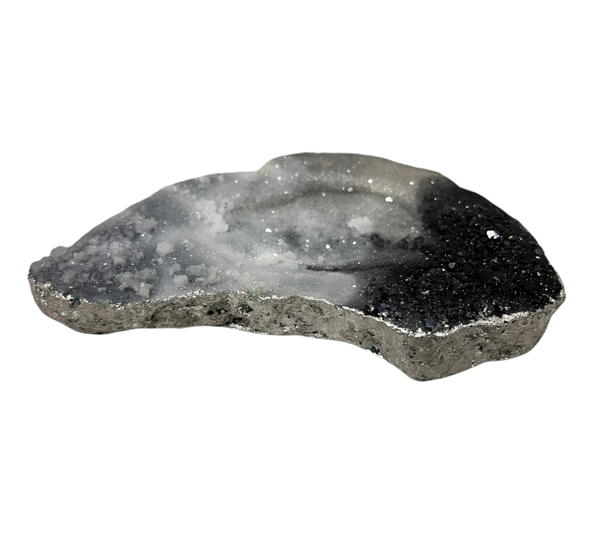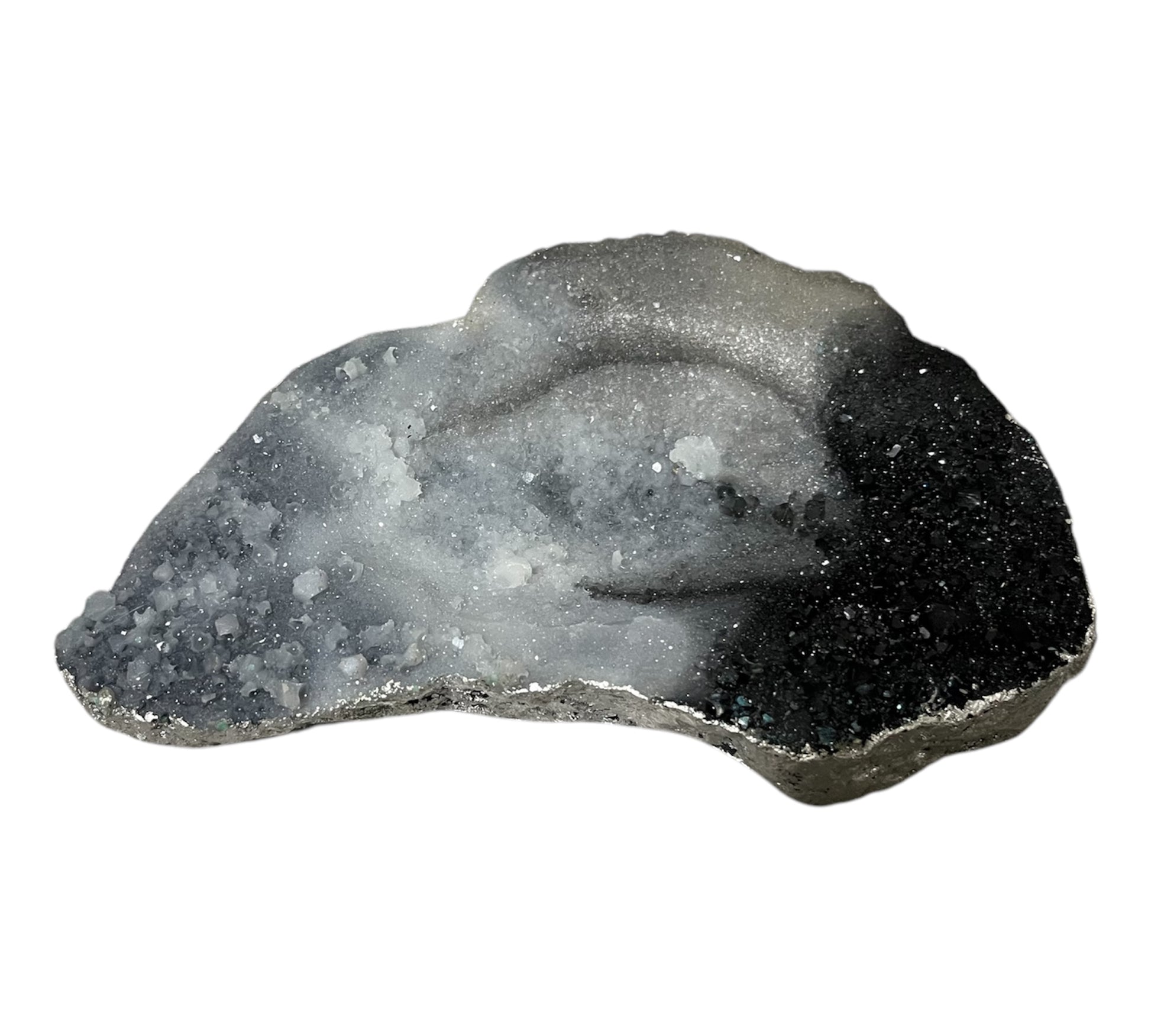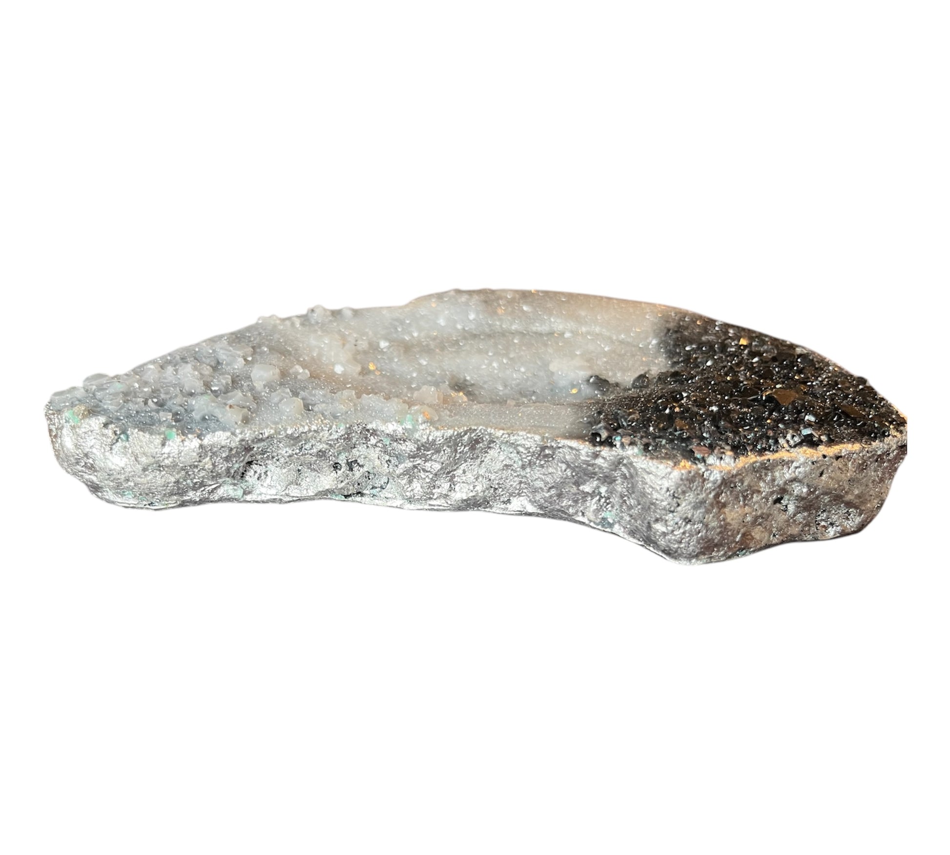 Kleine Schale in Kristalloptik. Sie besteht aus schwarz mit silber. Je nachdem wie man sie hält, funkelt sie. Der Rand wurde mit einem silbernem Lack bemalt. Die Schale ist an sich flach aber in der Mitte befindet sich eine kleine Mulde.