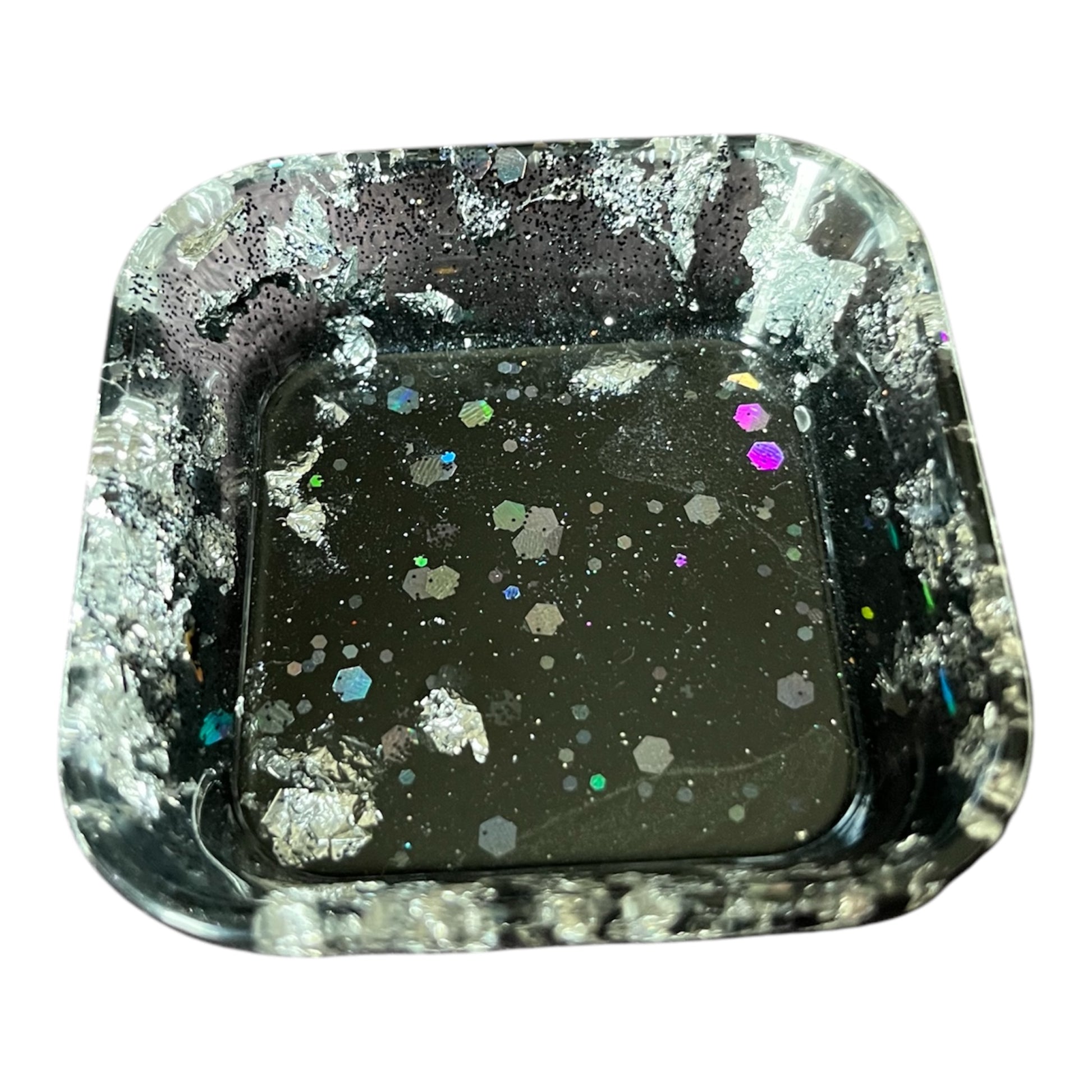 Handgemachte kleine niedliche Schale aus Resin. Die Schale wurde in einem schlichten schwarz mit Blattsilber, Multicolorglitzer und klarem Harz gegossen.