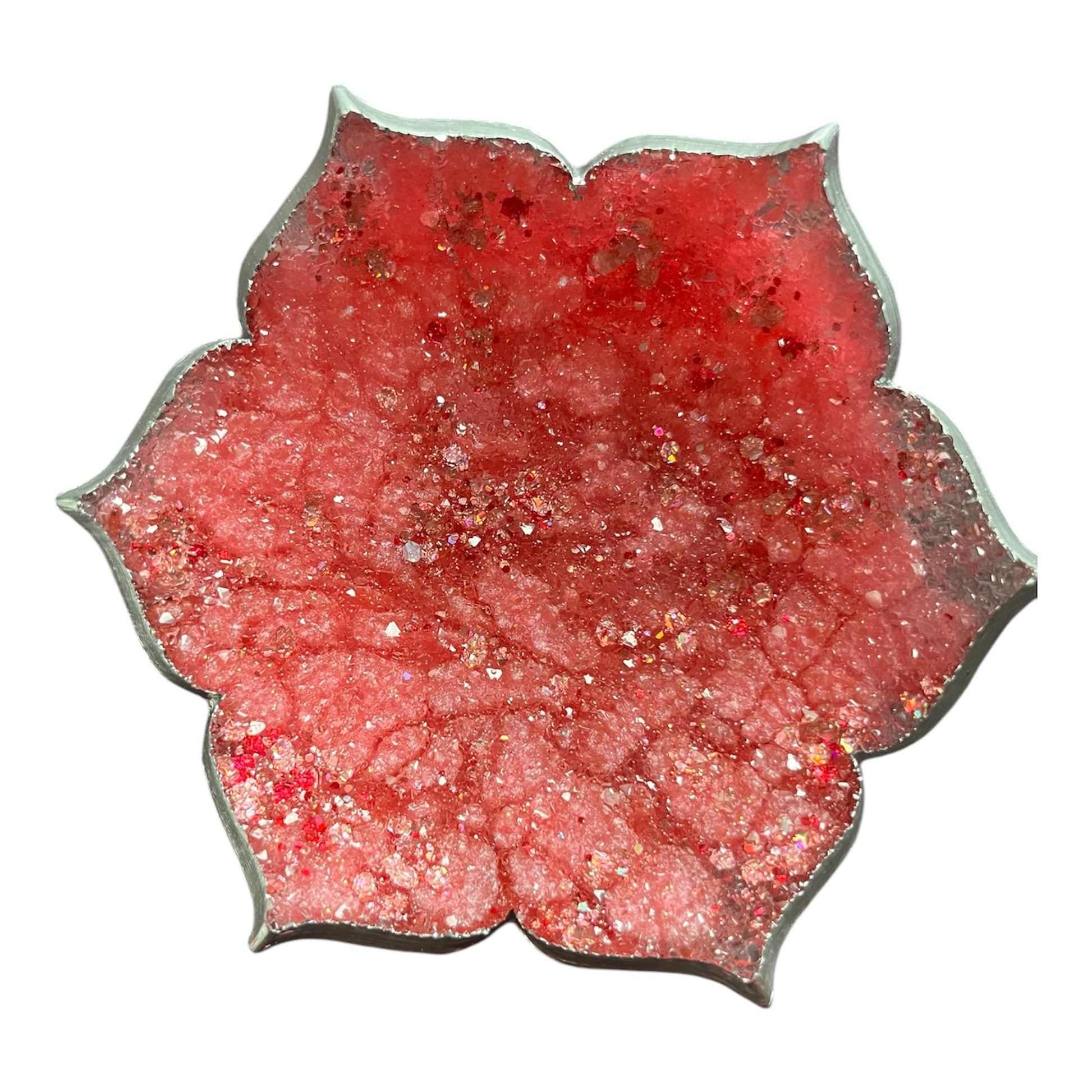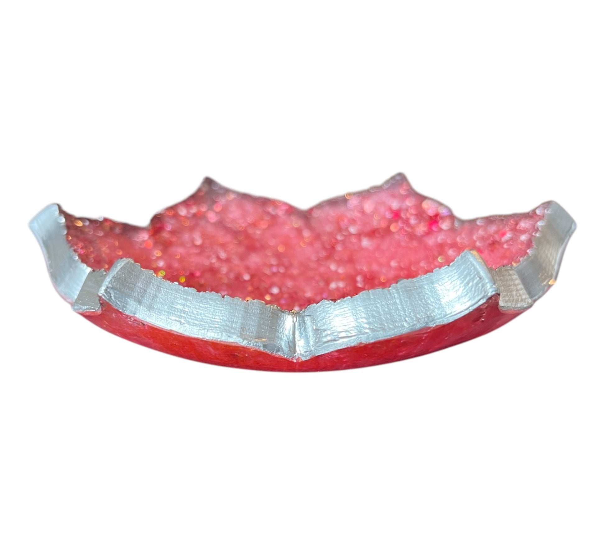Kleine runde Schale in Kristalloptik. Sie besteht aus rot, mit Blattsilber und klarem Harz. Je nachdem wie man sie hält, funkelt sie. Der Rand wurde mit einem silbernem Lack bemalt.