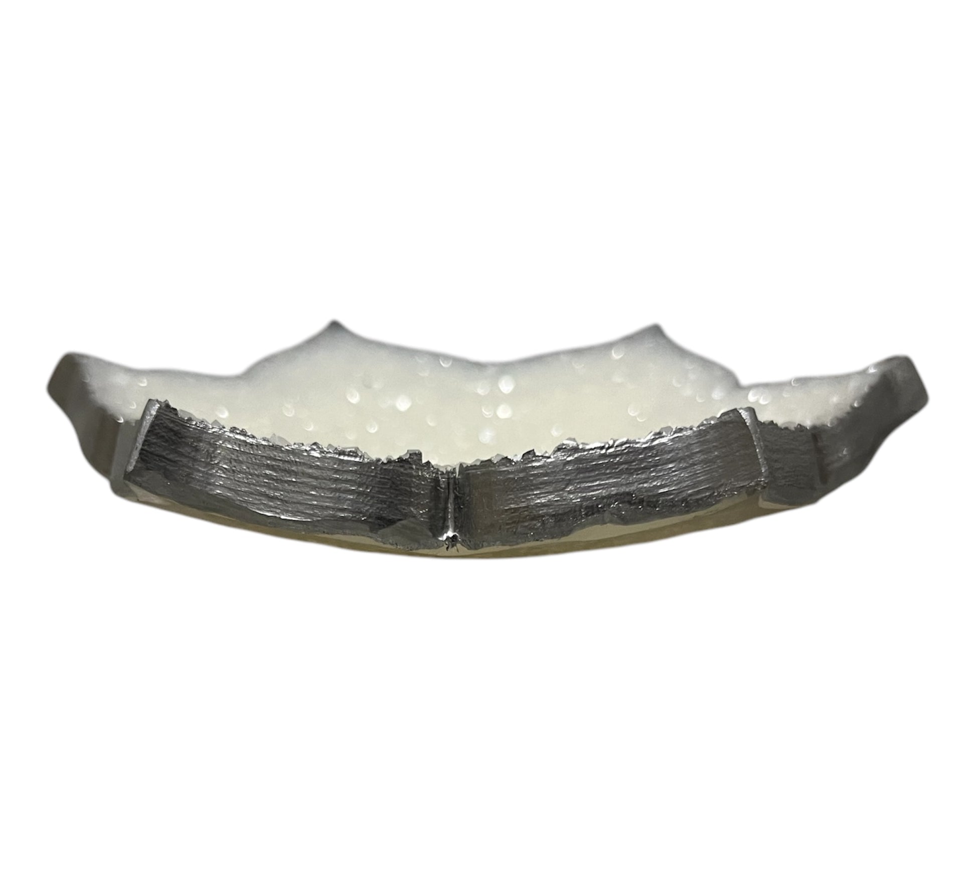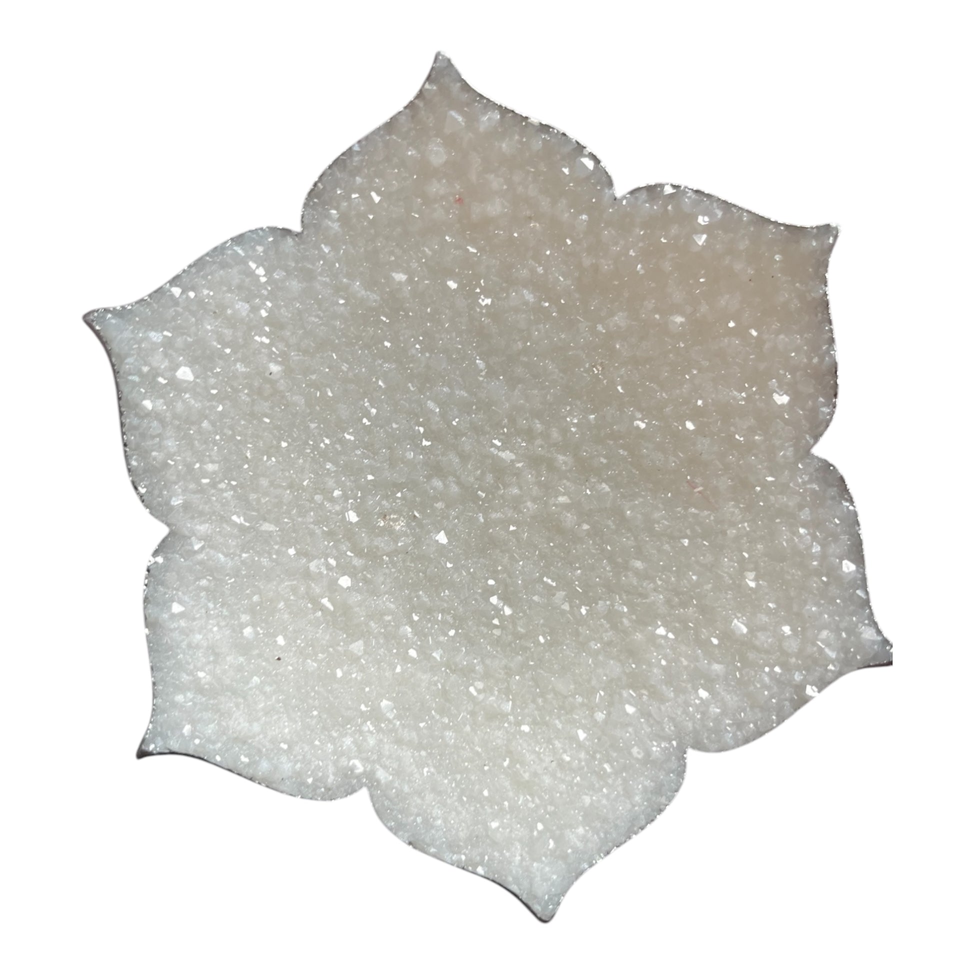 Kleine runde Schale in Kristalloptik. Sie besteht aus reinem weiß. Je nachdem wie man sie hält, funkelt sie. Der Rand wurde mit einem silbernem Lack bemalt.