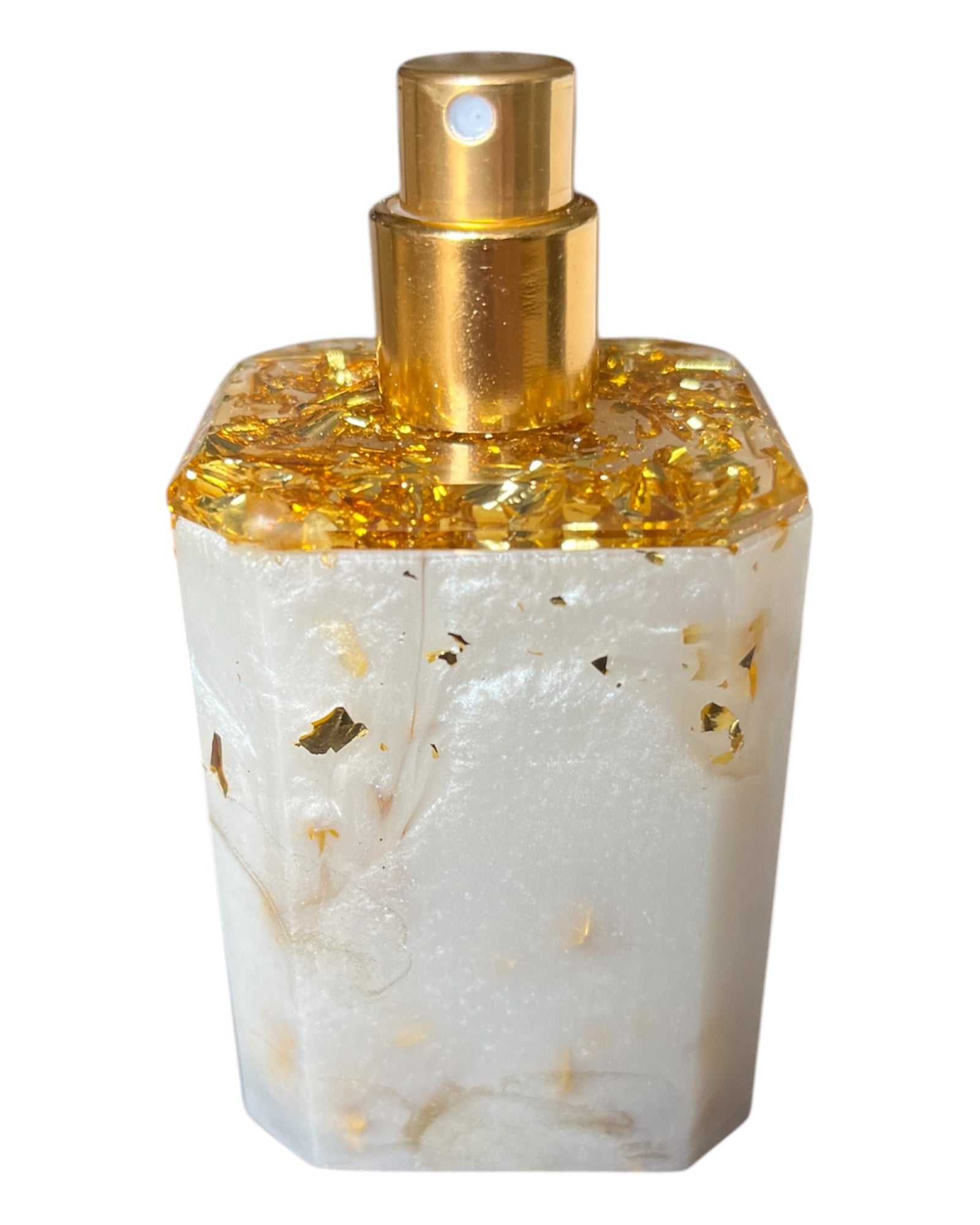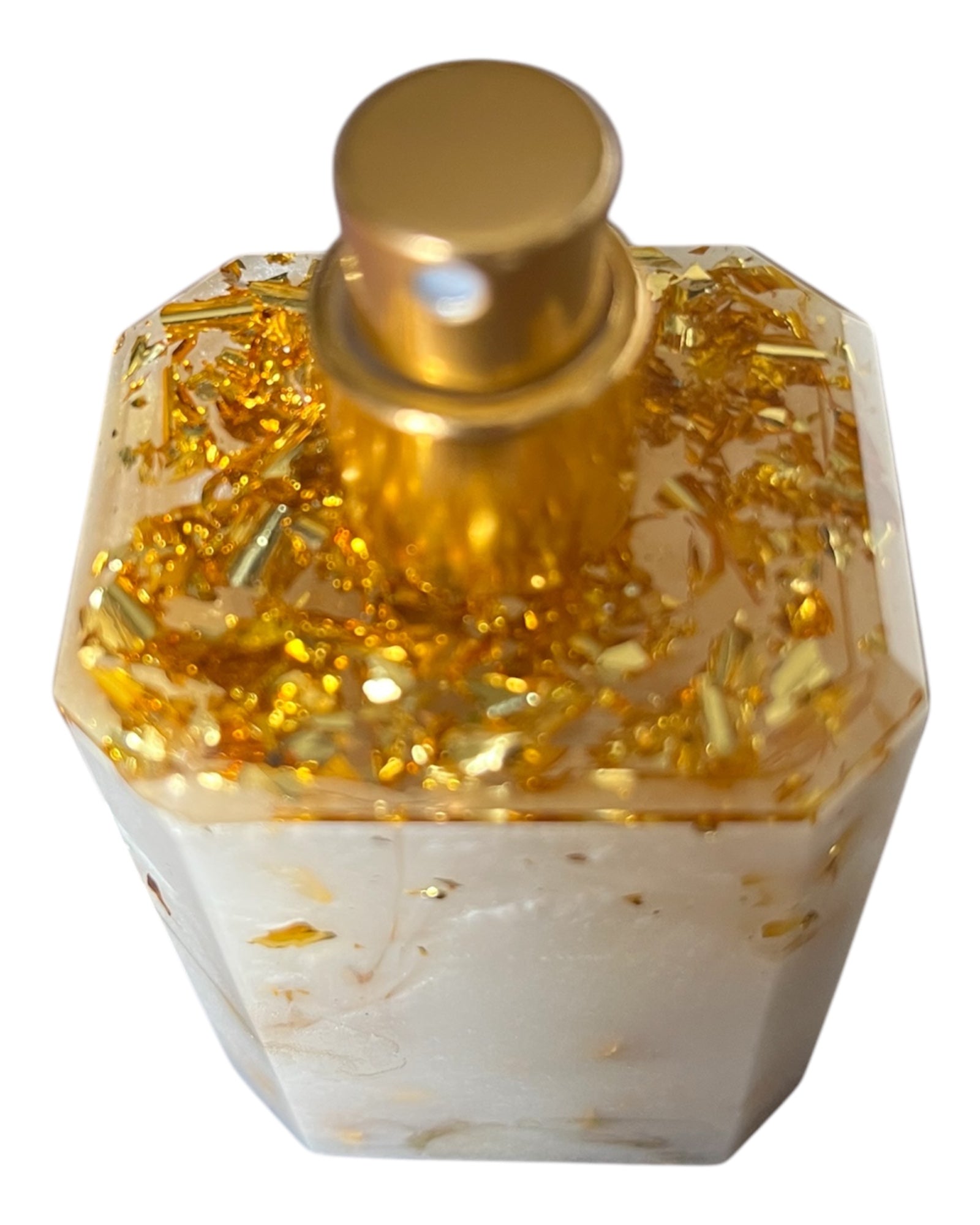 Handgemachte Parfumflasche aus Resin. Die Grundfarbe der Flasche ist weiß/gold mit Metallicgold. Der Deckel ist aus klarem Harz, mit Blattgold und ist nicht abnehmbar. Die Flasche sollte man im stehen lagern, da der Deckel nicht zu 100% dicht ist. Das Parfum wird oben wo der Pumpkopf sitzt befüllt.