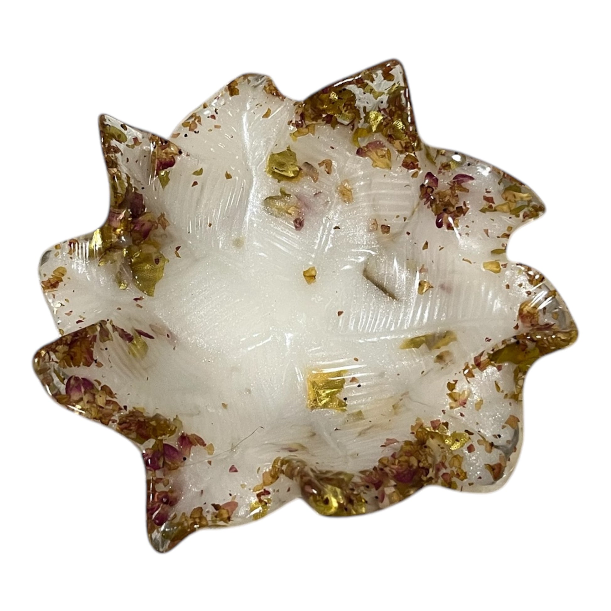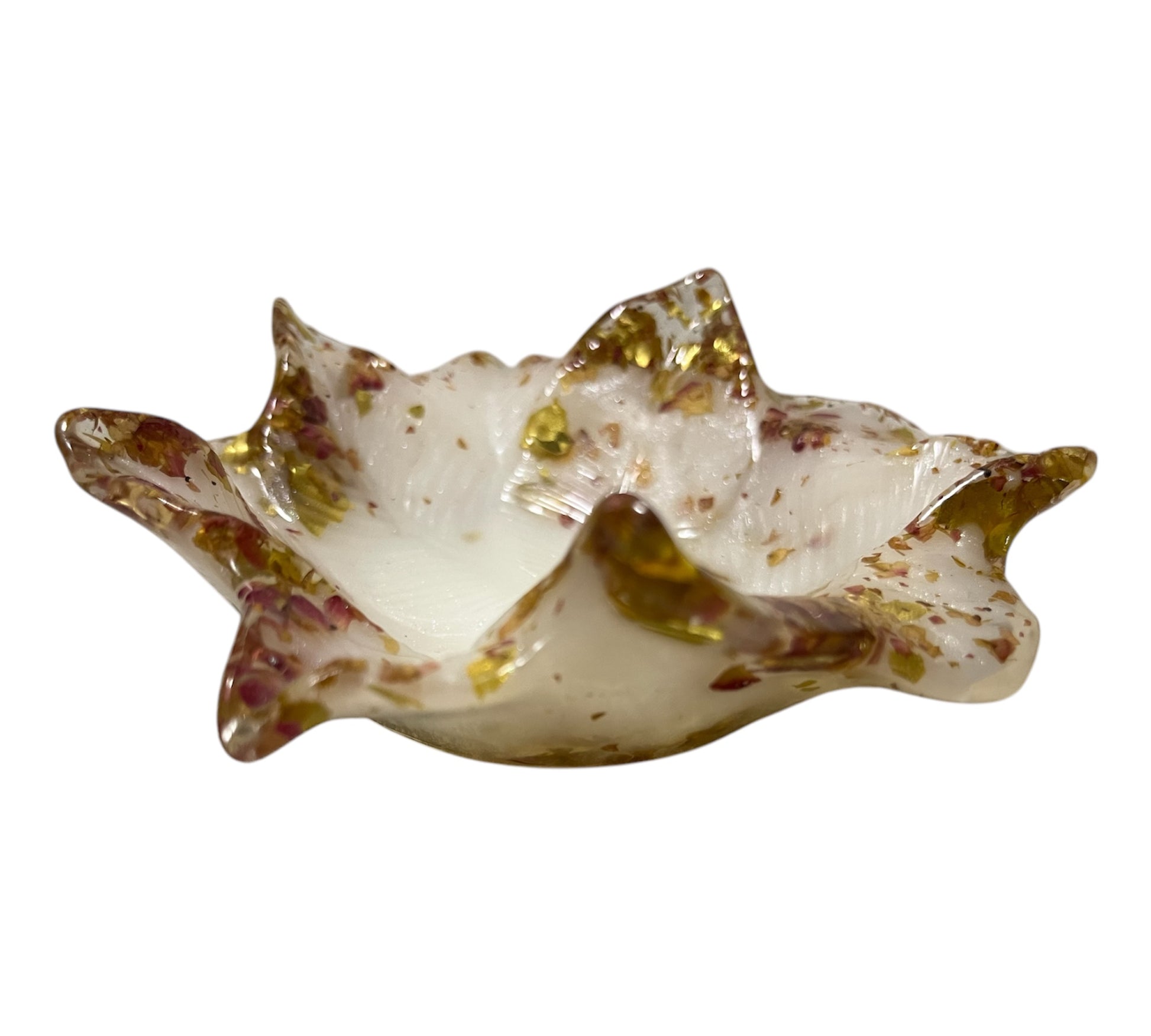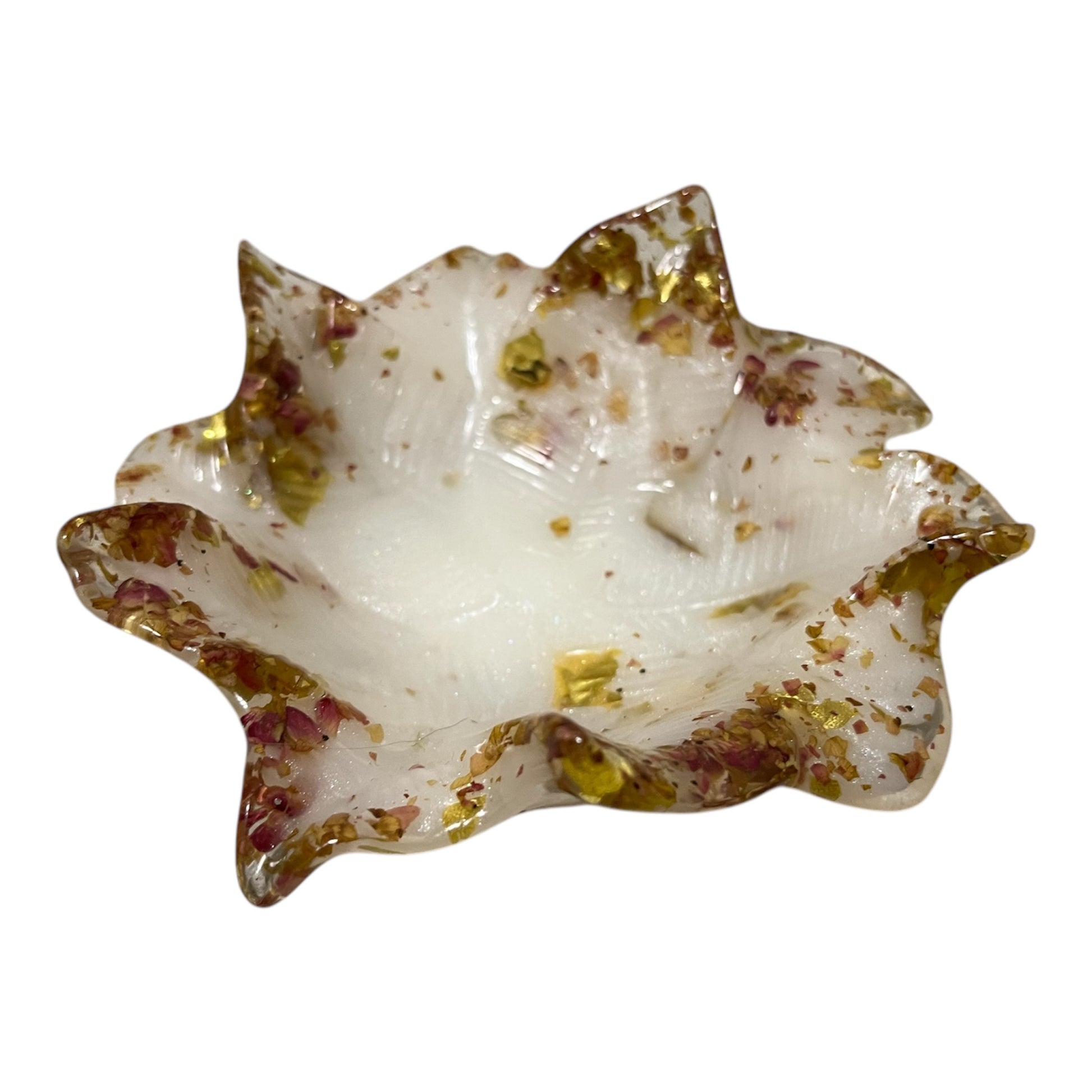 Kleine Runde Blattschale aus Resin. In diese Schale habe ich kleine Rosenblätter und Blattgold mit reingearbeitet.
