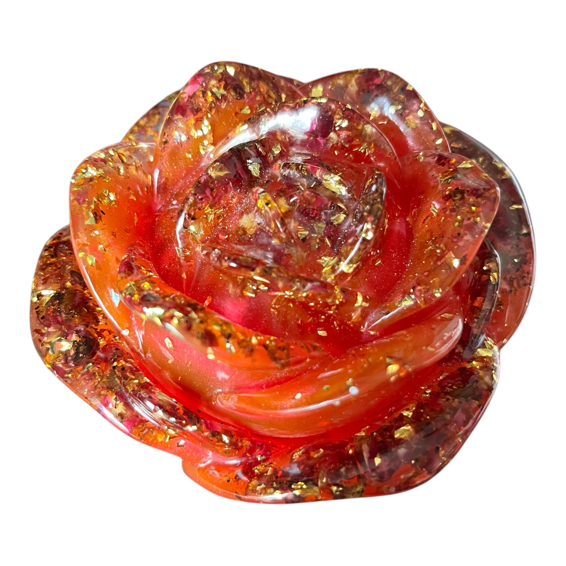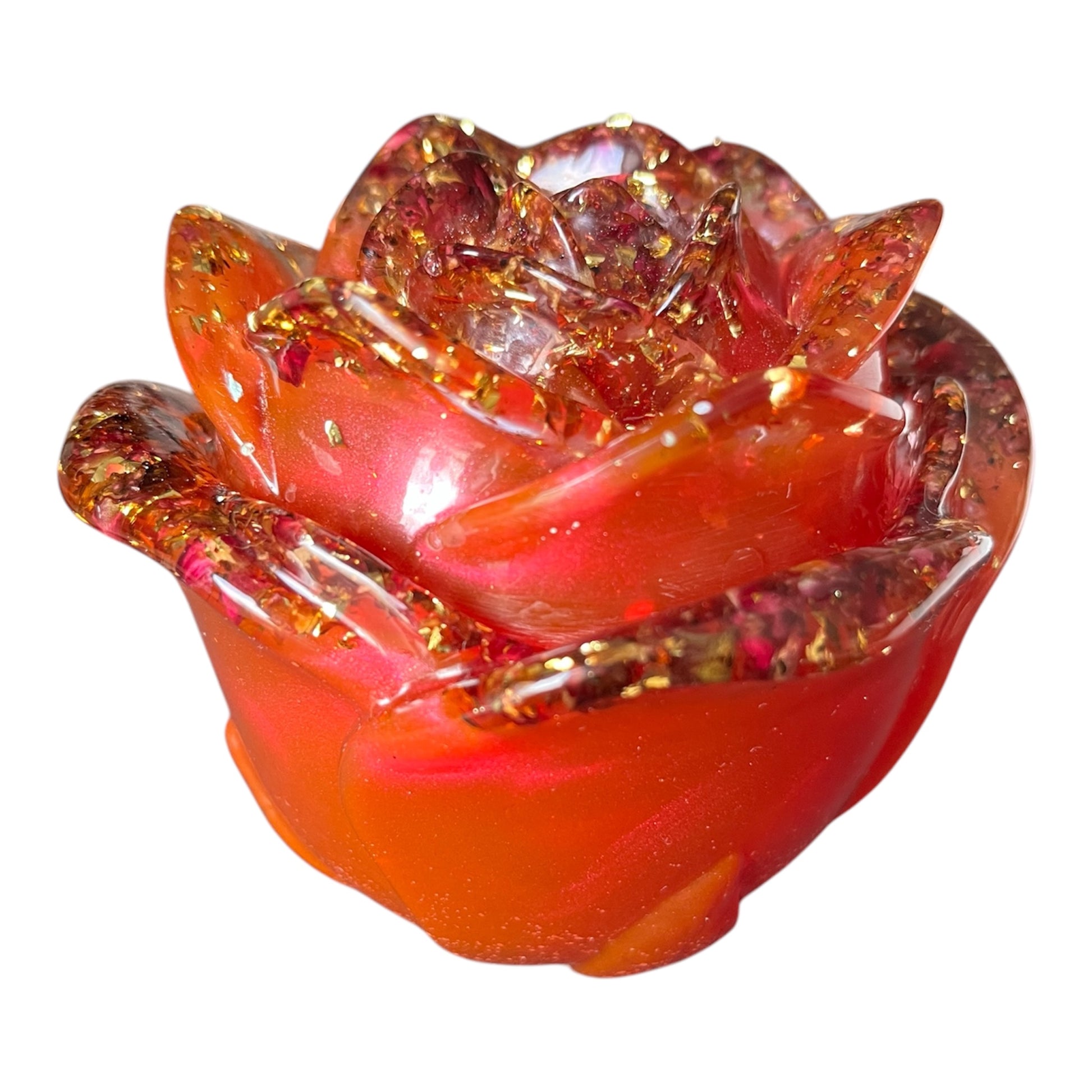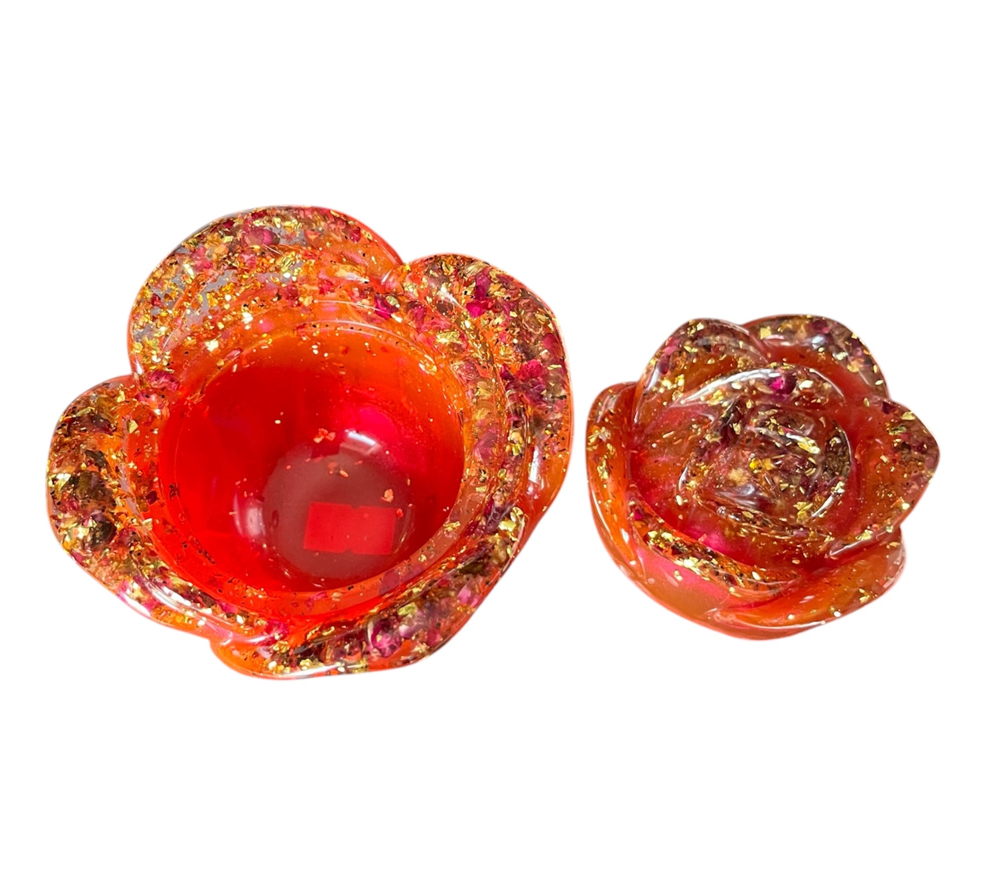 Diese wunderschöne Rosendose wurde aus Resin hergestellt. Sie besteht aus einem Rot mit einem Metalliceffekt, Blattgold, kleine Rosenblätter und klarem Harz.