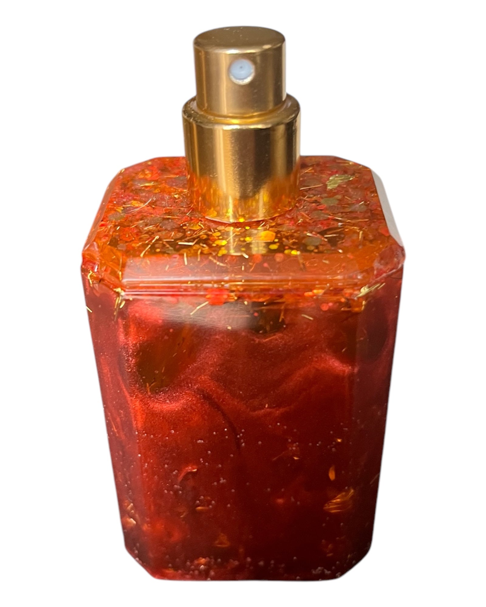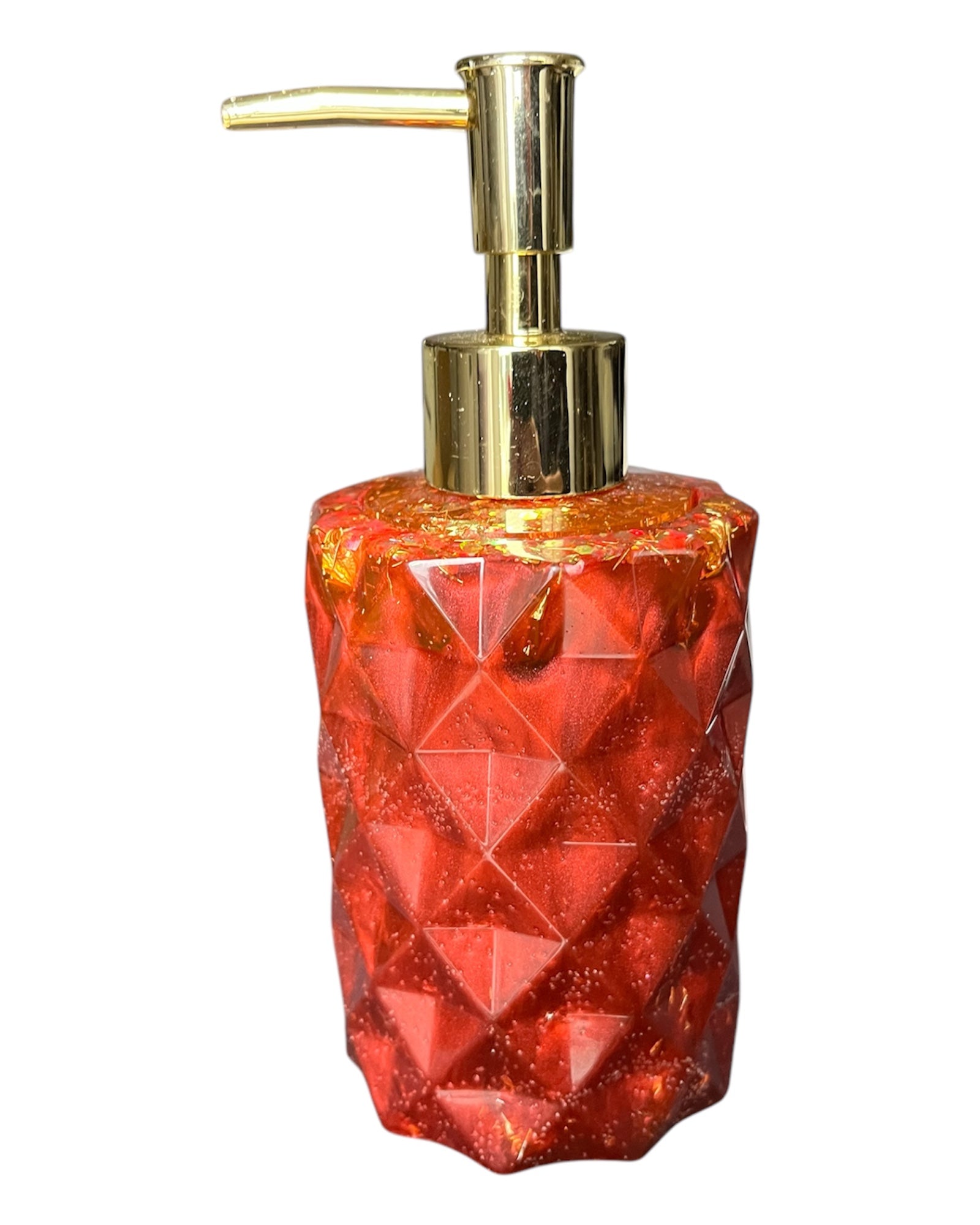Handgemachtes Set aus Resin. Die Grundfarbe ist orange und terracotta in Metallicoptik und Blattgold. Der Deckel ist in der gleichen Farbe, mit Blattgold und nicht abnehmbar. Dazu der passende Pumpkopf. Die Flaschen werden oben wo der Pumpkopf sitzt befüllt.