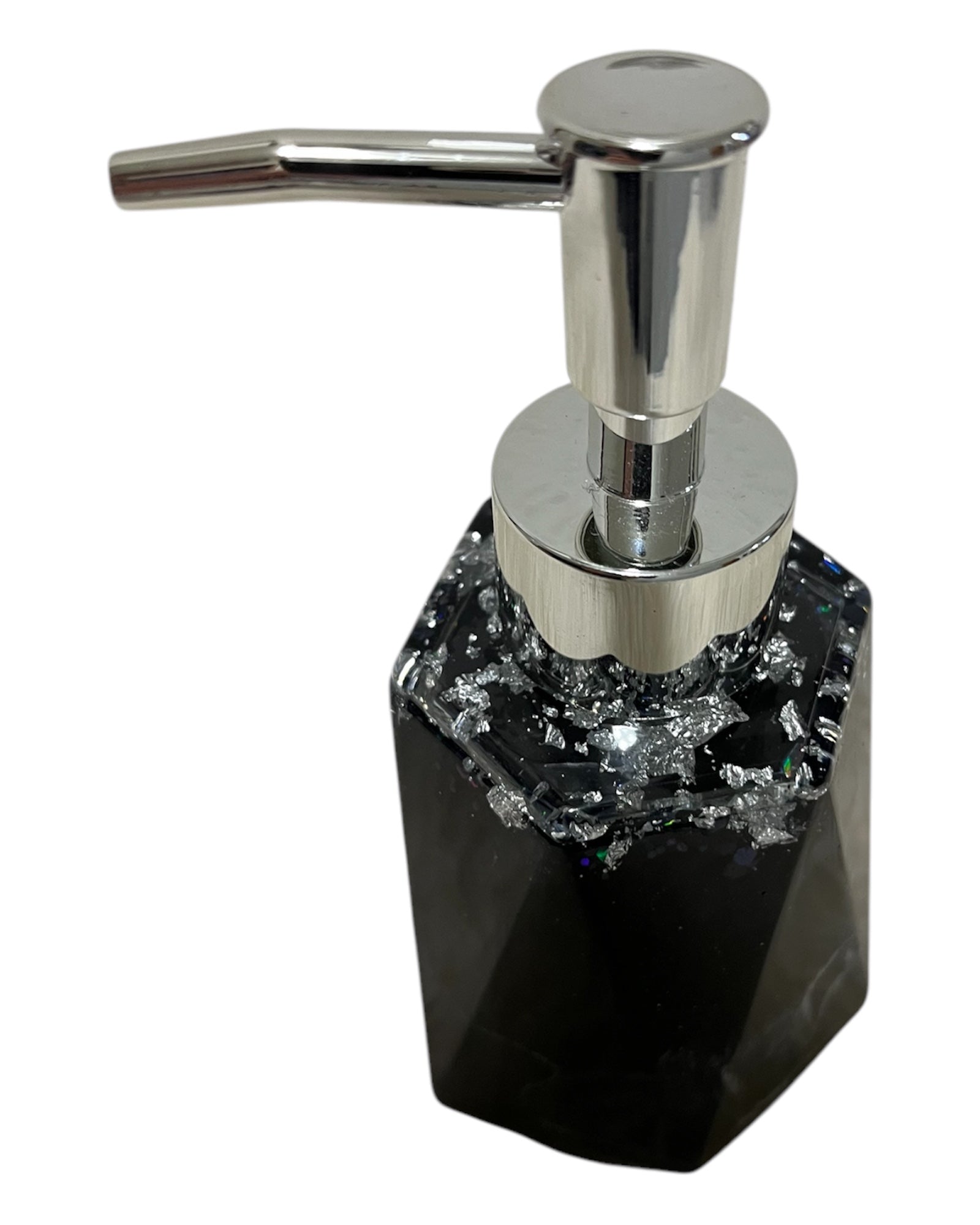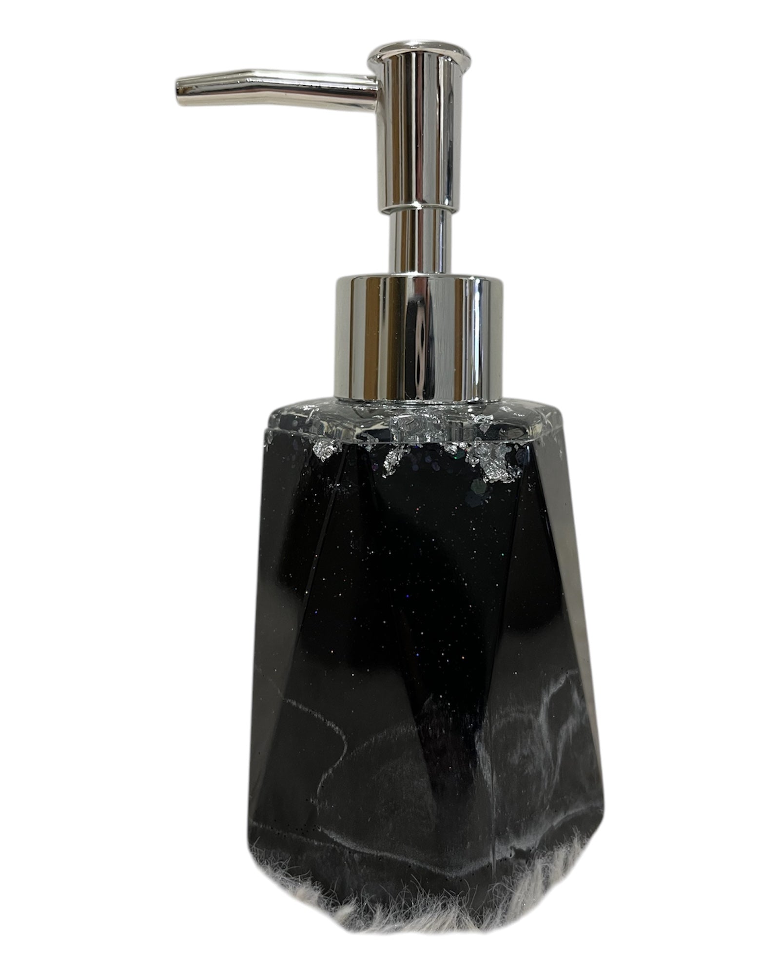 Handgemachter Seifenspender aus Resin. Die Grundfarbe des Spenders ist tiefschwarz mit Multicolor Glitzer und leichtem Metallicsilber. Der Deckel ist aus klarem Harz, mit Silberflocken und nicht abnehmbar. Dazu der passende Pumpkopf. Die Seife wird oben wo der Pumpkopf sitzt befüllt.