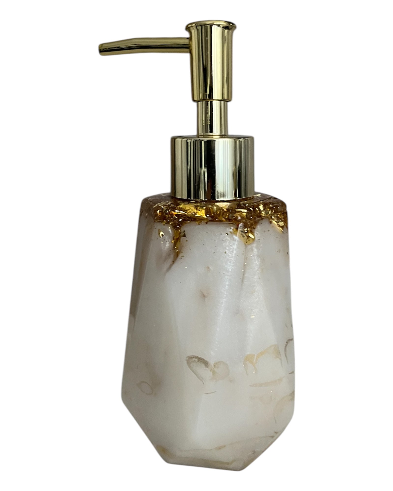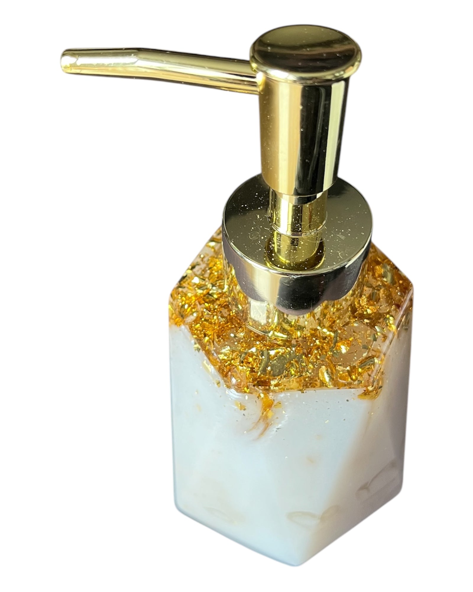Handgemachter Seifenspender aus Resin. Die Grundfarbe des Spenders ist weiß/gold mit Metallicgold. Der Deckel ist aus klarem Harz, mit Blattgold und nicht abnehmbar. Dazu der passende Pumpkopf. Die Seife wird oben wo der Pumpkopf sitzt befüllt.