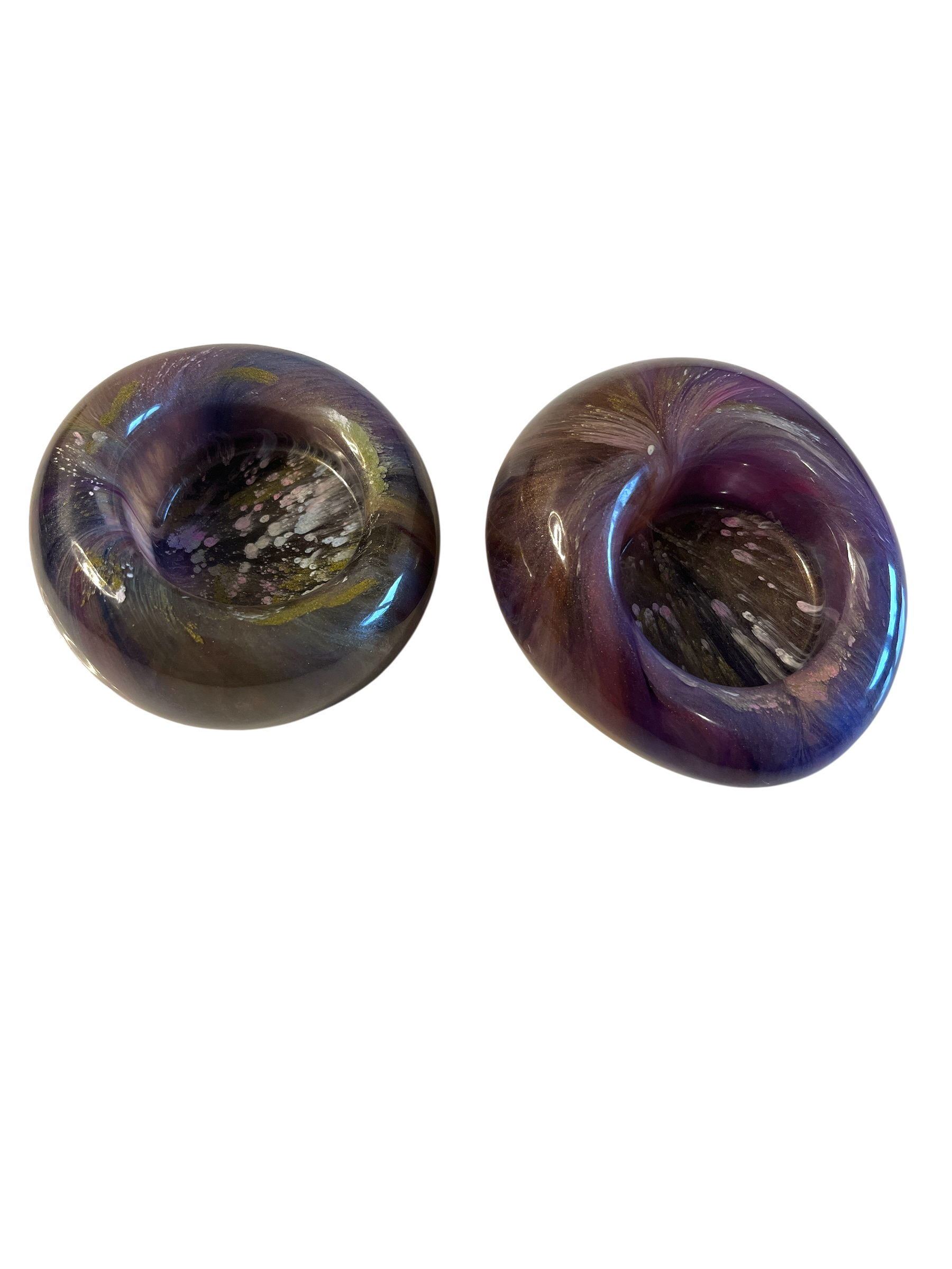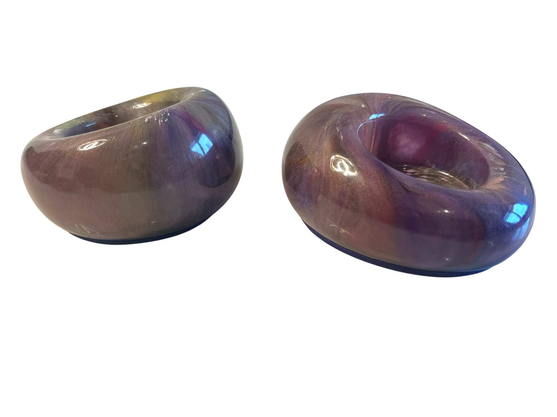 Dieses 2er Set bunter Teelichthalter bringt mit ihrem aufregenden Farbverlauf aus Lila, Grün und Weiß lebendige Energie in jeden Raum. Eingegossen in klares Harz und veredelt mit Alkohol-Ink-Farben, entsteht ein einzigartiges, faszinierendes Spiel aus Transparenz und Farbe, das deine Atmosphäre auf ein neues Level hebt. Ein mutiger Akzent für jeden Stil, der mutig und kreativ sein will.