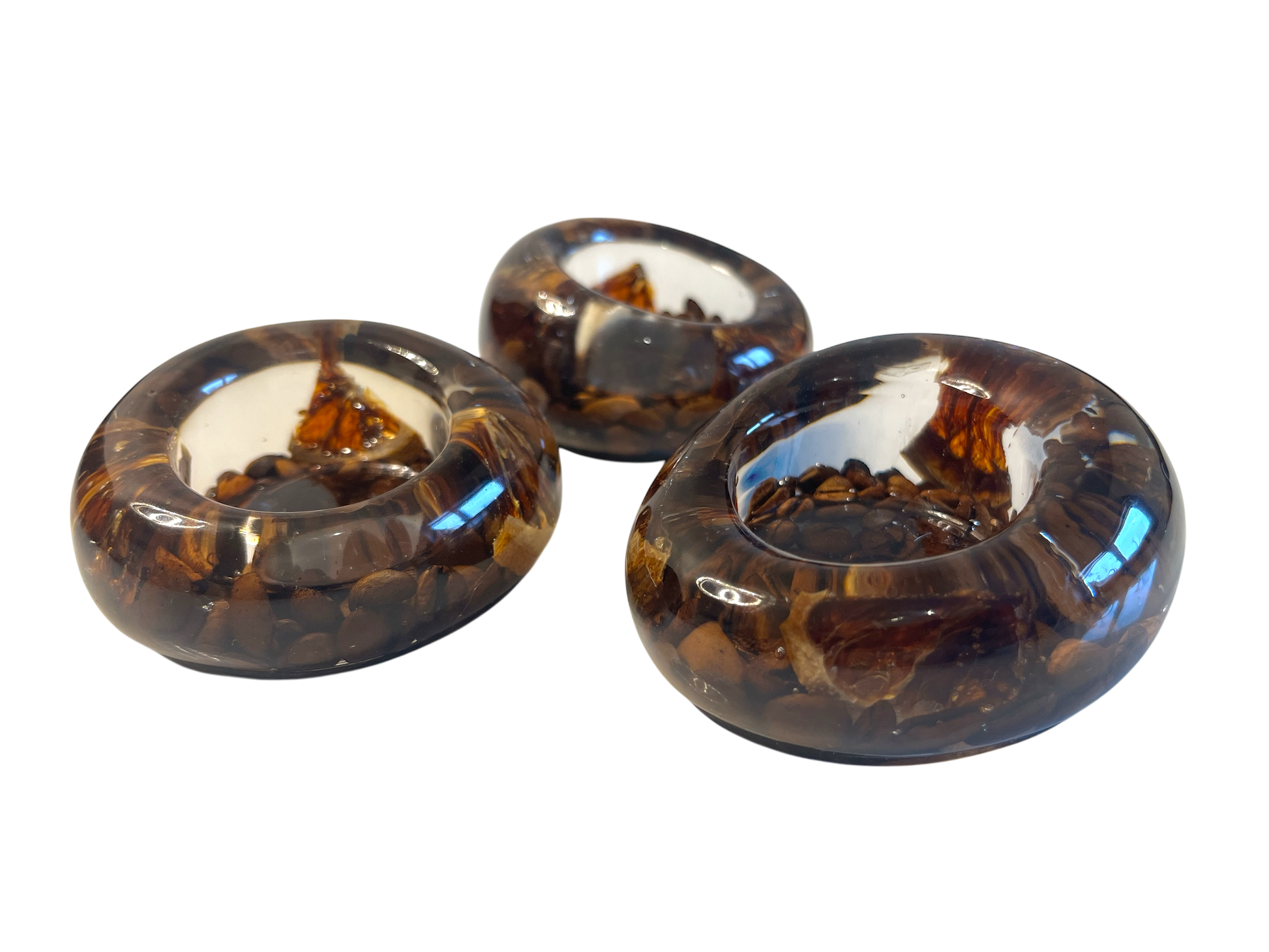 Dieses auffällige 3er Set Teelichthalter kombiniert klare Harzkunst mit echten Kaffeebohnen und getrockneten Orangenscheiben. Die lebendige Mischung aus natürlichen Elementen verleiht jedem Raum eine wilde, sinnliche Atmosphäre und zieht alle Blicke auf sich. Setzen Sie mit diesem Design ein kraftvolles, originelles Statement, das Ihre Leidenschaft für außergewöhnliche Details zeigt.