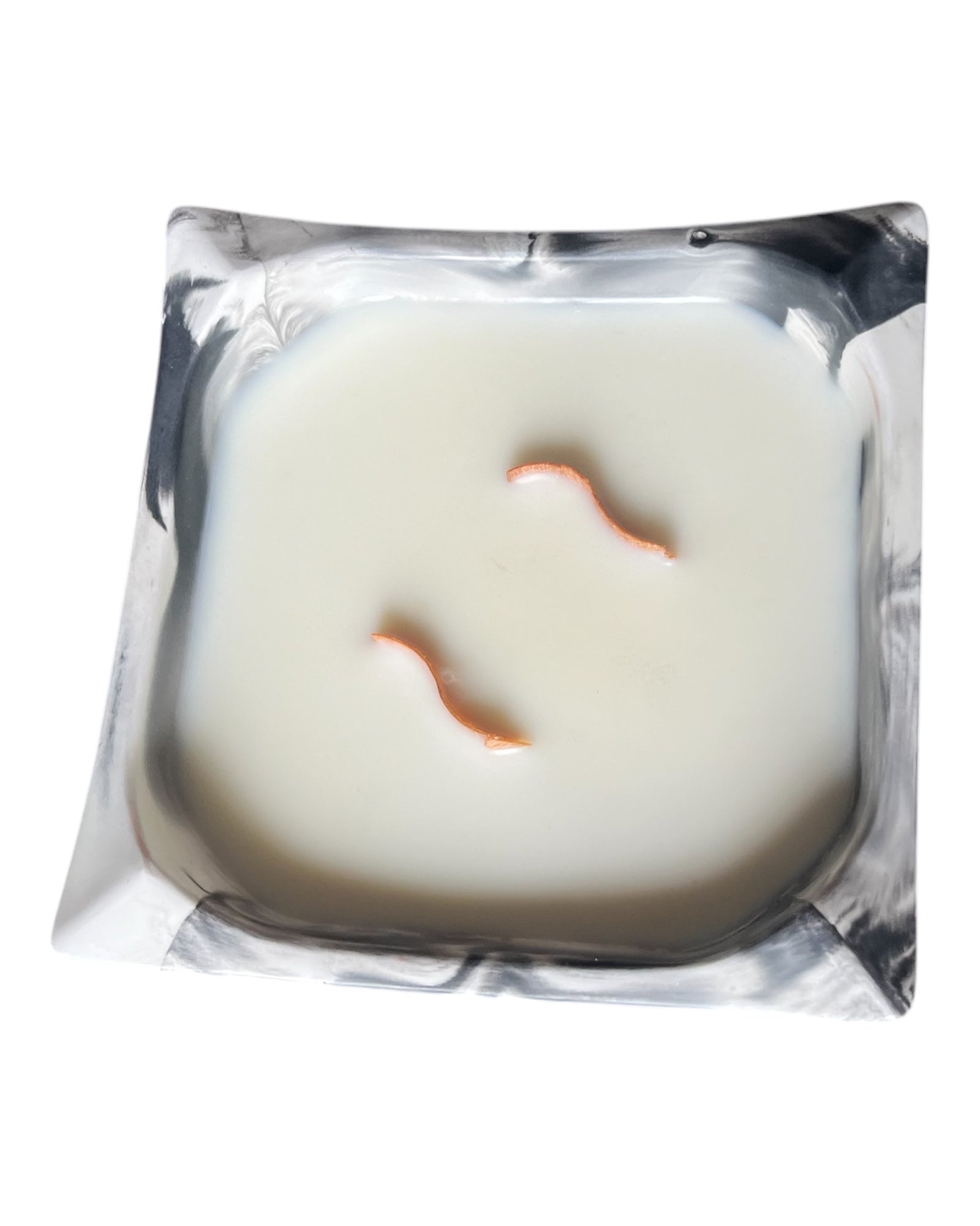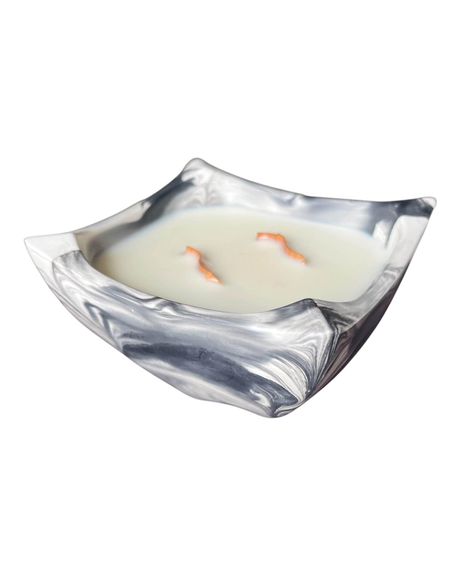 Diese Schale hat einen Marmoreffekt aus schwarz und weiß. Es befinden sich 2 S - Holzdochte darin. Ein Duft ist kaum wahrnehmbar, außer der Duft von Sojawachs. Der Wachsanteil beträgt ca 200 g.